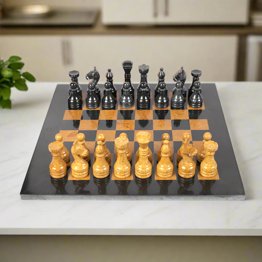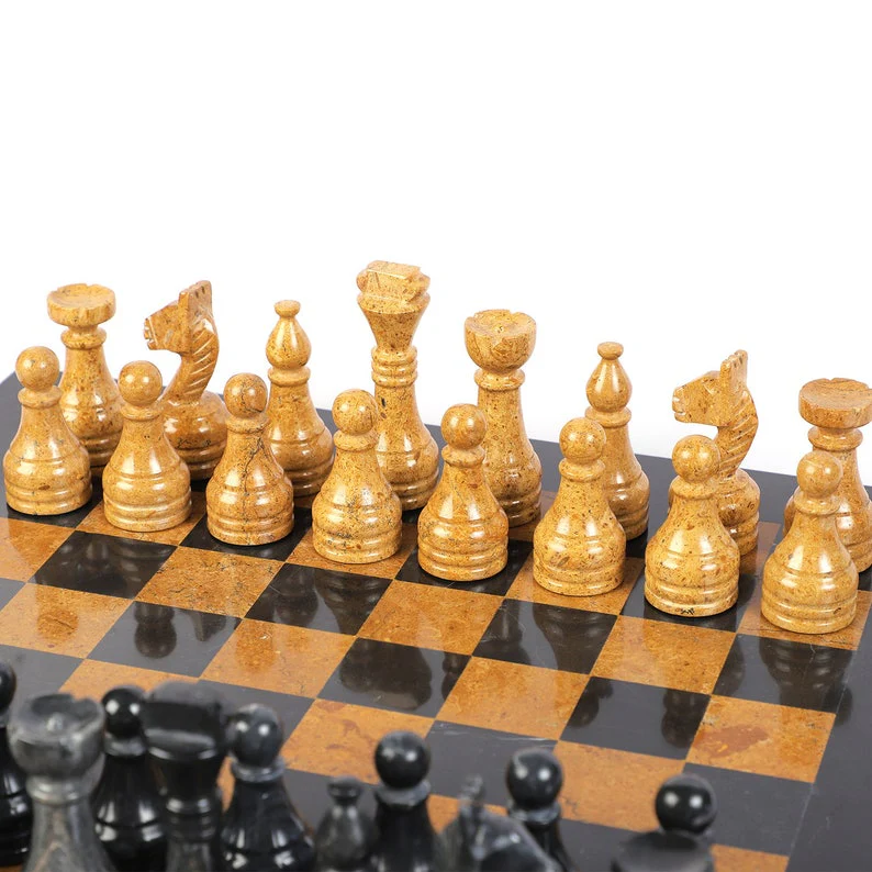 Indulge in the rich contrast and timeless beauty of our Black & Golden Marble Chess Set. Crafted from premium black and golden marble, this exquisite set brings luxurious sophistication to your game nights. Perfect for those who cherish the finest craftsmanship and elegant design.