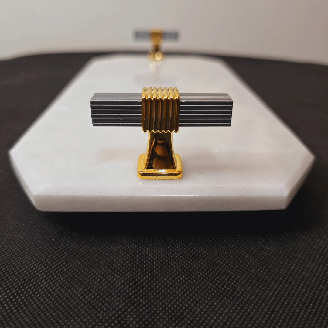 What makes it stand out? Its unique octagonal shape paired with sleek grey and gold handles gives it a subtle but bold personality  perfect for modern interiors that celebrate clean lines and classic materials.